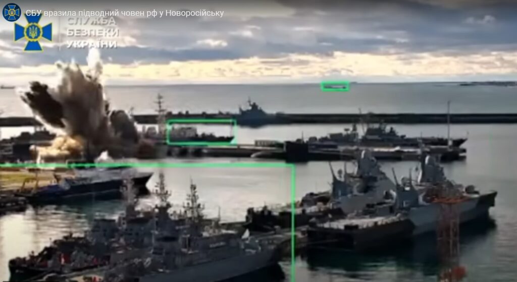 Vaizdo įrašai SSU svetainėje, kurie, atrodo, buvo nufilmuoti dienos šviesoje nuo kranto zonos virš Novorosijsko karinio jūrų laivyno bazės (greičiausiai iš apžvalgos taško išilgai greitkelio M-4, einančio į šiaurės vakarus/pietryčius nuo bazės), rodo didelį sprogimą, kai povandeninis laivas buvo užpultas laivagalyje.